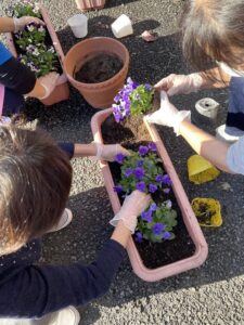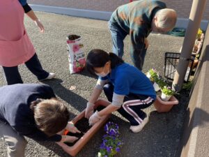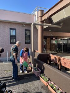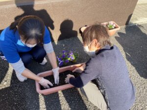 秋晴れ☀のあったかい日……、デイ利用者様たちは、玄関前に“ビオラ”を植え替えてくれました(^^♪