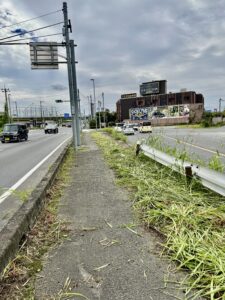 地域の方々が安全・安心して生活できるように、施設周辺の道路等の簡易的な除草作業など行っています。草木で見通しが悪く送迎事故の危険がある場所や、小中学生の通学路を主に点検し一時的な作業を行います。その際に通学路のアスファルト損傷等を発見し行政への通報も行いました (^O^)/